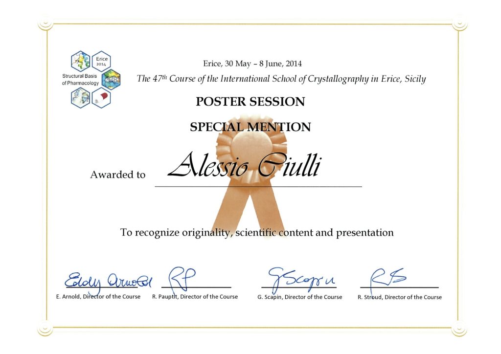 Our Lab’s poster on chemical & structural biology of bromodomains was awarded the “Special Mention” Prize at the 47th International School of Crystallography “Structural Basis of Pharmacology” in Erice, Italy Previous Post Lab Christmas Dinner 2013 Next Post ESMEC 2014