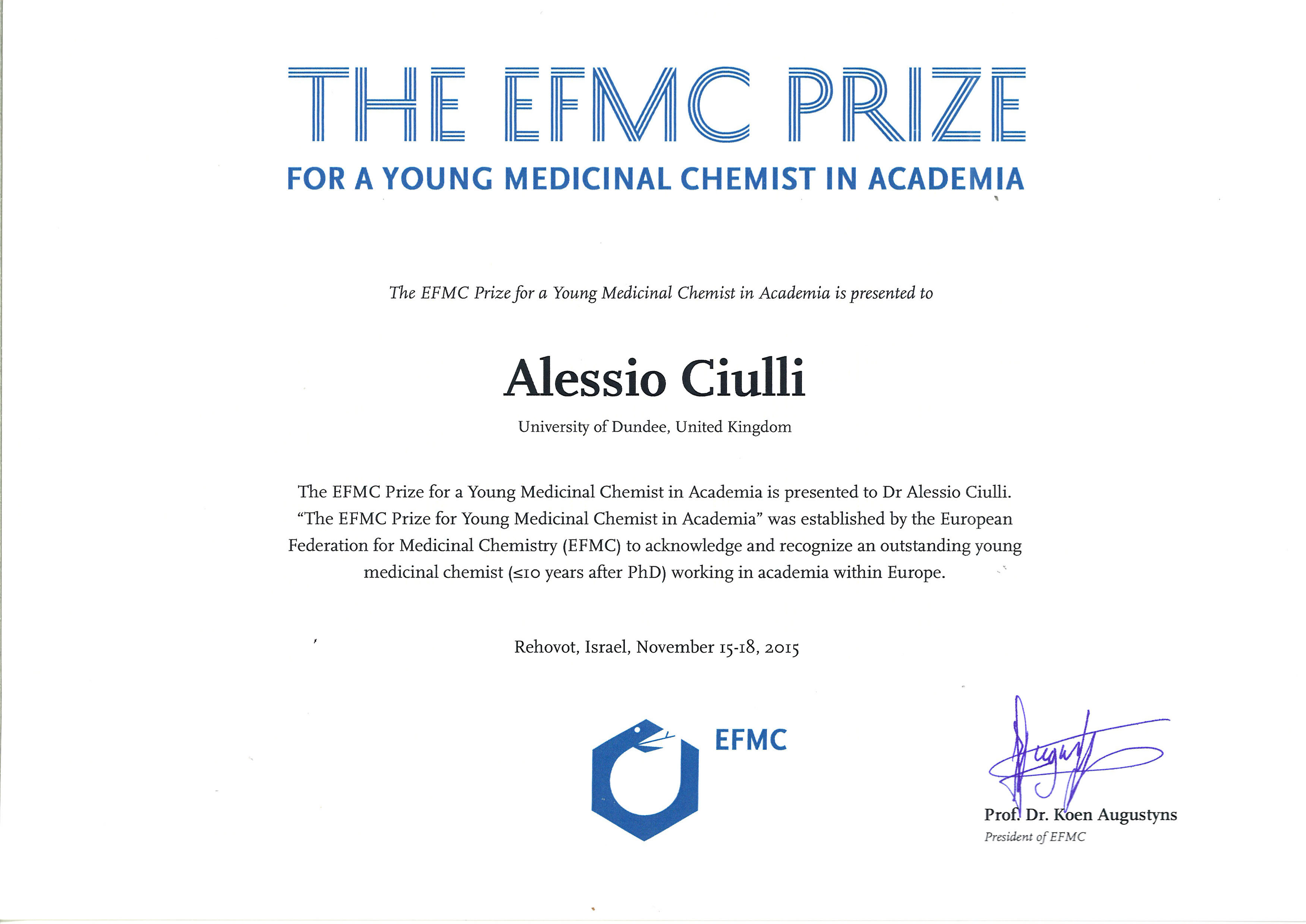 Alessio Ciulli is designated as the winner of the 2015 EFMC Prize for a Young Medicinal Chemist in Academia.