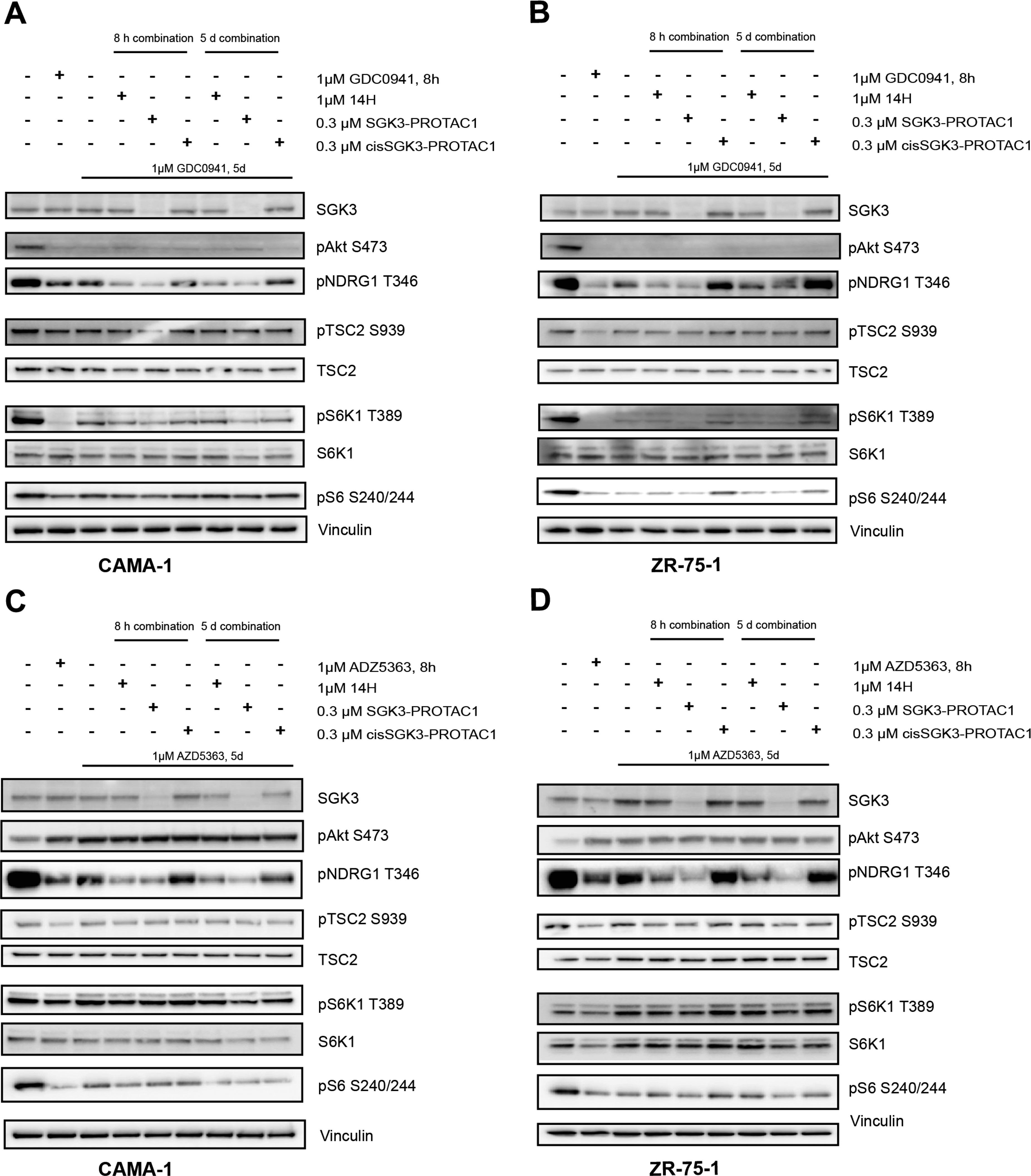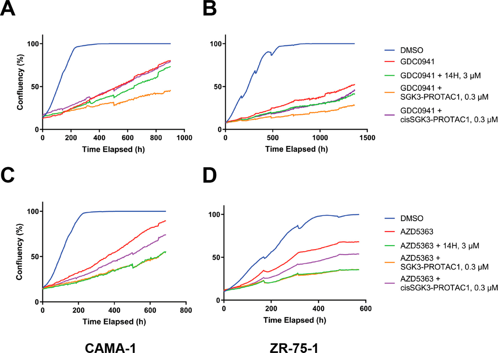 Low doses of SGK3-PROTAC1 (0.1–0.3 μM) restored sensitivity of SGK3 dependent ZR-75-1 and CAMA-1 breast cancer cells to Akt (AZD5363) and PI3K (GDC0941) inhibitors, whereas the cis epimer analogue incapable of binding to the VHL E3 ligase had no impact. SGK3-PROTAC1 suppressed proliferation of ZR-75-1 and CAMA-1 cancer cell lines treated with a PI3K inhibitor (GDC0941) more effectively than could be achieved by a conventional SGK isoform inhibitor (14H).