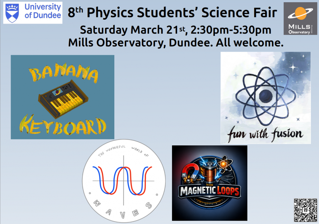 In March 2025, we celebrated our 7th Physics Students’ Science Fair, as usual, packed with many new games and experiments: we played with time and space, with light and sounds, we followed stars to their end, and tried to make objects follow our magnets. Going on to the 7th edition of the fair is a big feat, which will not be feasible without the collaboration of the Level 3 Physics/Physics with Astrophysics/Math & Physics Students from the University of Dundee. Click on the poster below to see some of the pictures.
