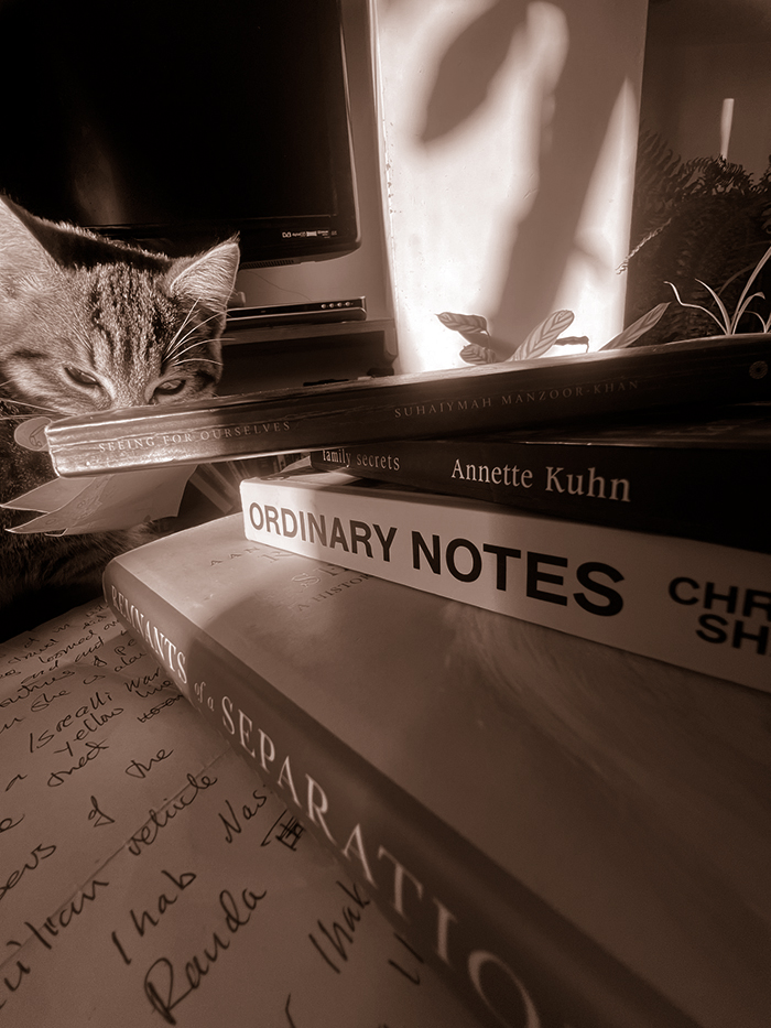 Whilst making The Ring in the Fish I read books relating to material memory, including Annette Kuhn’s Family Secrets and Remnants of Partition by Aanchal Malhotra; I needed to enter a space where I was open to other peoples’ testimonies: these works charted a self-reflexive terrain;  enabling me to articulate my own concerns more clearly, unpicking interrelations between official scripts and internal remembrance. In Seeing for Ourselves Suhaiymah Manzoor-Khan’s heartfelt grappling with ethical conundrums of representation was indispensable. But I’ve chosen to start with Ordinary Notes by Christina Sharpe a book I read after my exhibition was prematurely closed due to CCA management’s inability to adequately respond to the surge of feeling surrounding the genocide in Gaza and signing PACBI (The Palestinian Campaign for the Academic and Cultural Boycott of Israel). I found her attention to form exciting and the depth of feeling in a time of both political and personal turmoil instructive.