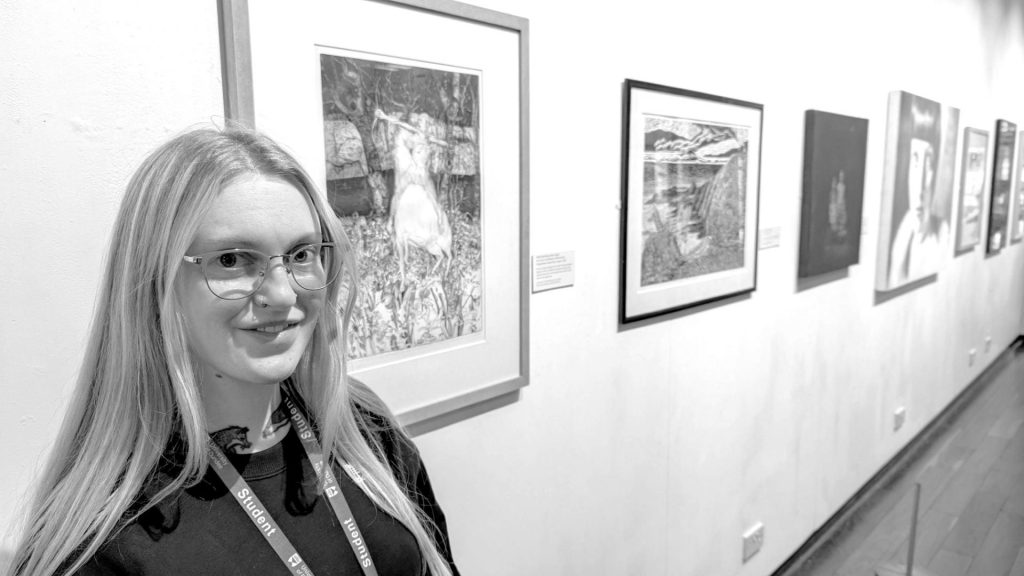 Hello, my name is Molly, and I am student on the MFA Curatorial Practice course at DJCAD. For the last two months of the course, I have been on placement within the University’s Museum Collections. During this time, I was given the opportunity to curate an exhibition based solely on black and white art held in the collections. It was an exciting chance to put all that I have learned during the course into practice and curate my first solo exhibition.