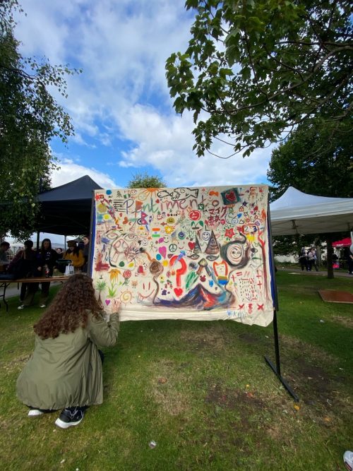 I ran two art walls last semester. Every art wall had a prompt for example, the first one I ran for a week during freshers’ week in September 2023 was ‘How are you feeling today?’. We had over 200 students participate and painted small bits on a massive piece of canvas paper.