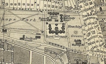 Another in our occasional series from Archive Services on how Dundee has changed. Dundee Royal Infirmary (DRI) was once one of the UK’s leading teaching hospitals. It had a rich 200 year history before its final closure in 1998, and the old main building, now converted into flats, remains one of Dundee’s most striking works of architecture. First known as Dundee Infirmary, it was originally located just to the south of Bucklemaker Wynd (the forerunner of Victoria Road), though access was from a long drive off King Street.