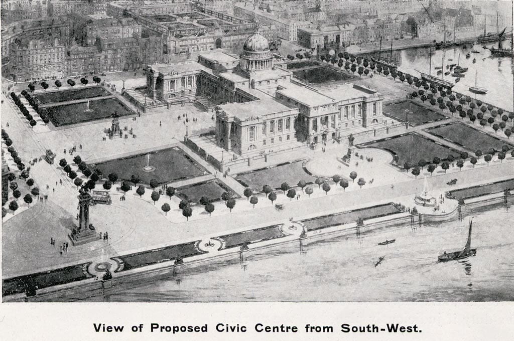 This was to have been the city’s architectural crown and Thompson planned to site it on the waterfront on land reclaimed by filling in some of the docks; the design above is situated on the Earl Grey Docks site. What is now the Malmaison is the building in the top left of the image. Thompson’s vision included widening streets and, in the case of Union Street, “the view of the river would be restored, and more than ample spaces for public purposes would be provided.’ Thompson concluded “while it might be suggested that the proposal looks far ahead of present day requirements … the possibilities of the future must be provided for.”