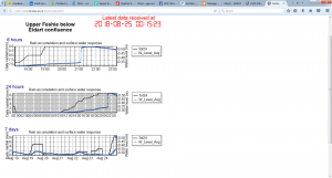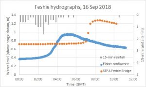 We’ve seen the opposite situation earlier in the summer: steep hydrographs in the headwaters attenuating downstream, notably a 150 mm rise in 3 minutes which was barely noticeable once it made its way downstream to Feshie Bridge. I’m going to say nothing today about causes, but just mention in-channel friction, rainfall patterns, and gradients. Some hydrographs below to illustrate. More evidence to gather first.