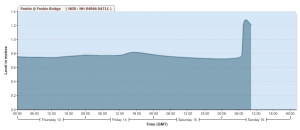 Today, we have a hydrograph which has steepened as it travelled downstream, leading to a 400+mm rise at SEPA’s Feshie Bridge gauging station in 30 minutes. In the upper catchment the rainfall has been steady, rarely exceeding 4 mm/hr, leading to a fairly gradual rise.