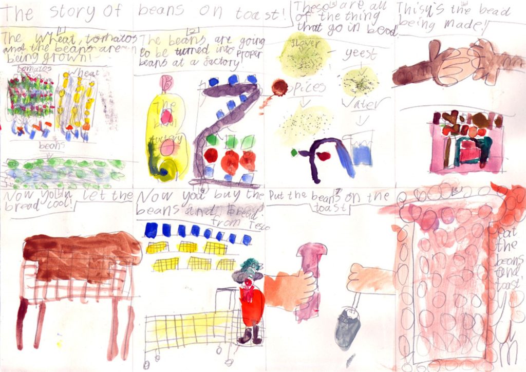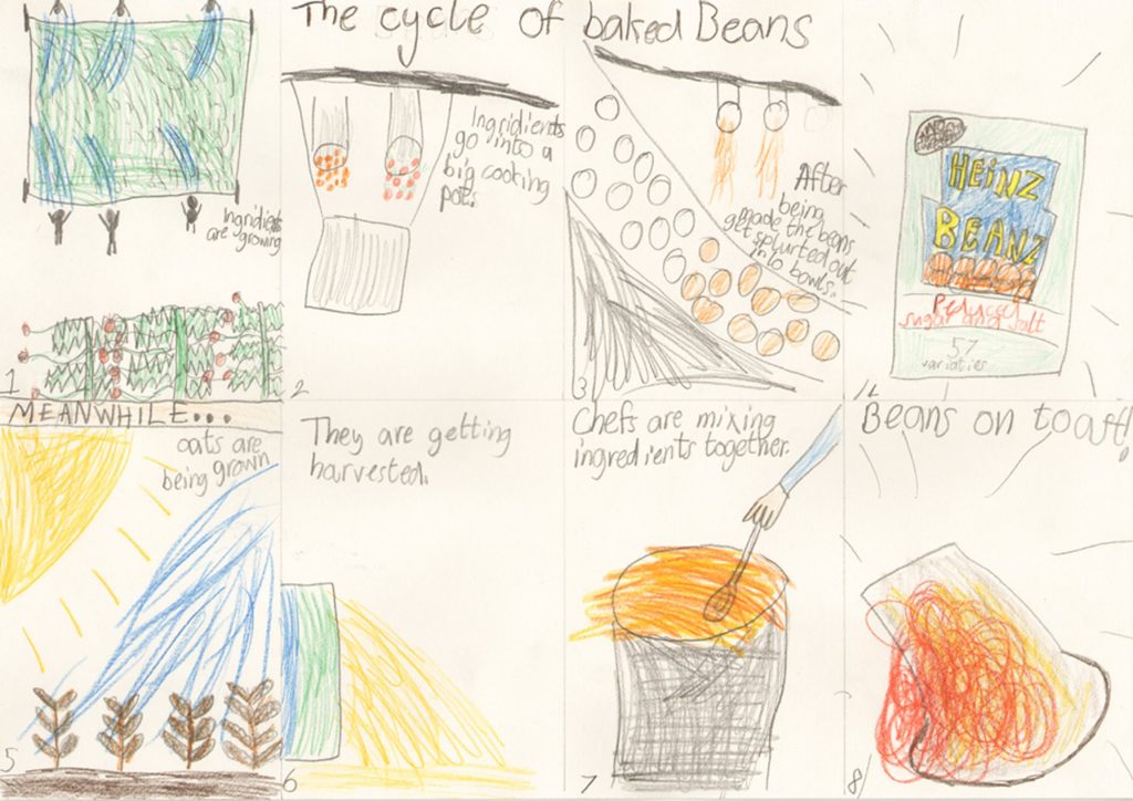 We cooked and ate beans on toast with the children in the classroom before explaining Sarah’s findings and discussing water use. The children then created some fabulous Beans on Toast story boards.