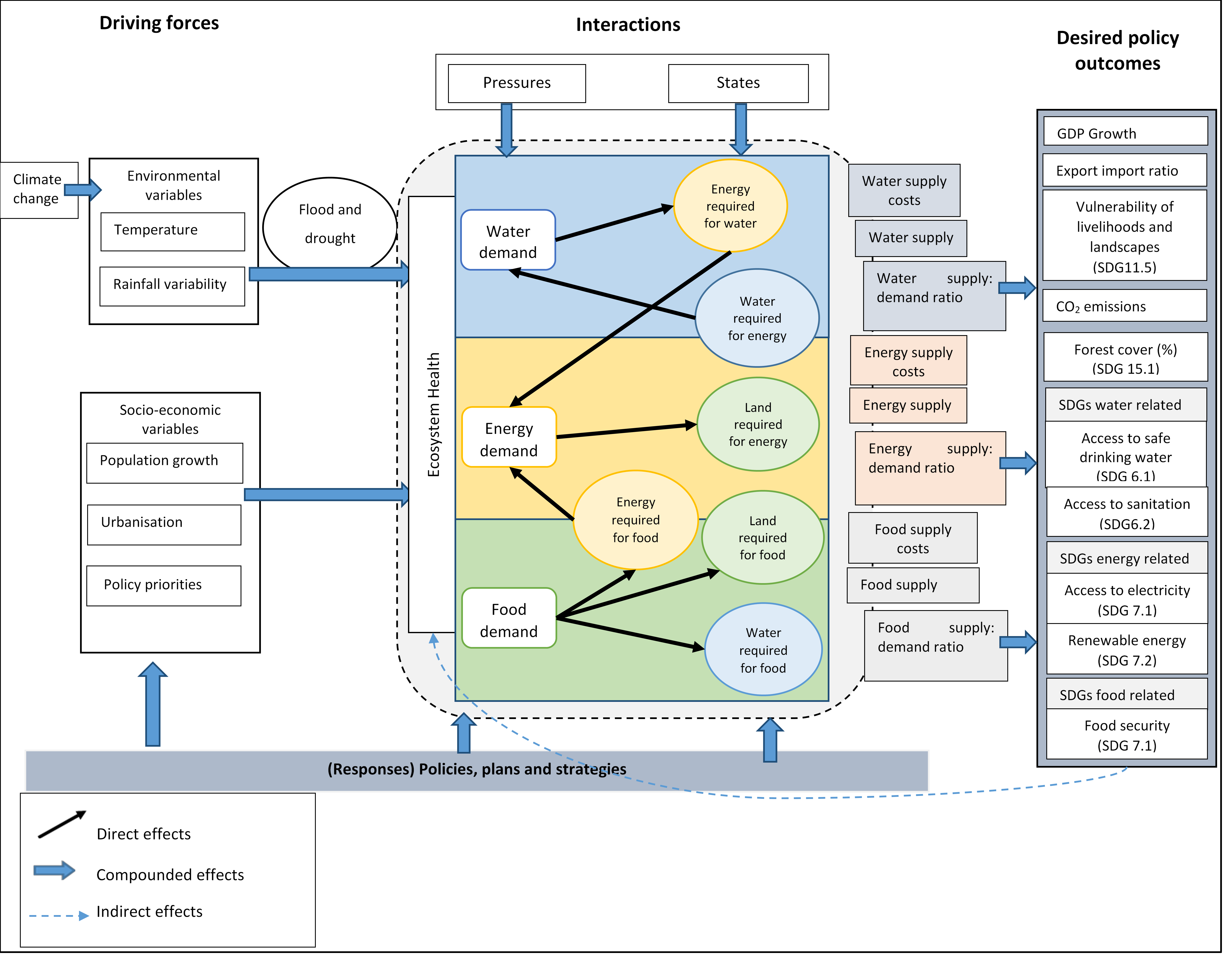 I interviewed some key national stakeholders in the WEF sectors in Malawi to identify the key challenges in the WEF sectors and understand the WEF system of Malawi (Figure 1). I used the DPSIR (drivers-pressures-states-impacts-responses) framework to understand the intra-sectoral and inter-sectoral interactions of the identified challenges. Understanding the challenges and how they interact can enable policy makers and decision makers to integrate not only across sectors and across scales, from local to regional and address the challenges for sustainable development.